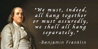 American Declaration of Independence. Each of the 13 states squabbled and argued with one another in an effort to gain the best benefits for each state, but ultimately, these 56 men recognized the truth of Benjamin Franklin’s words, “We must, indeed, all hang together, or most assuredly, we shall all hang separately.”